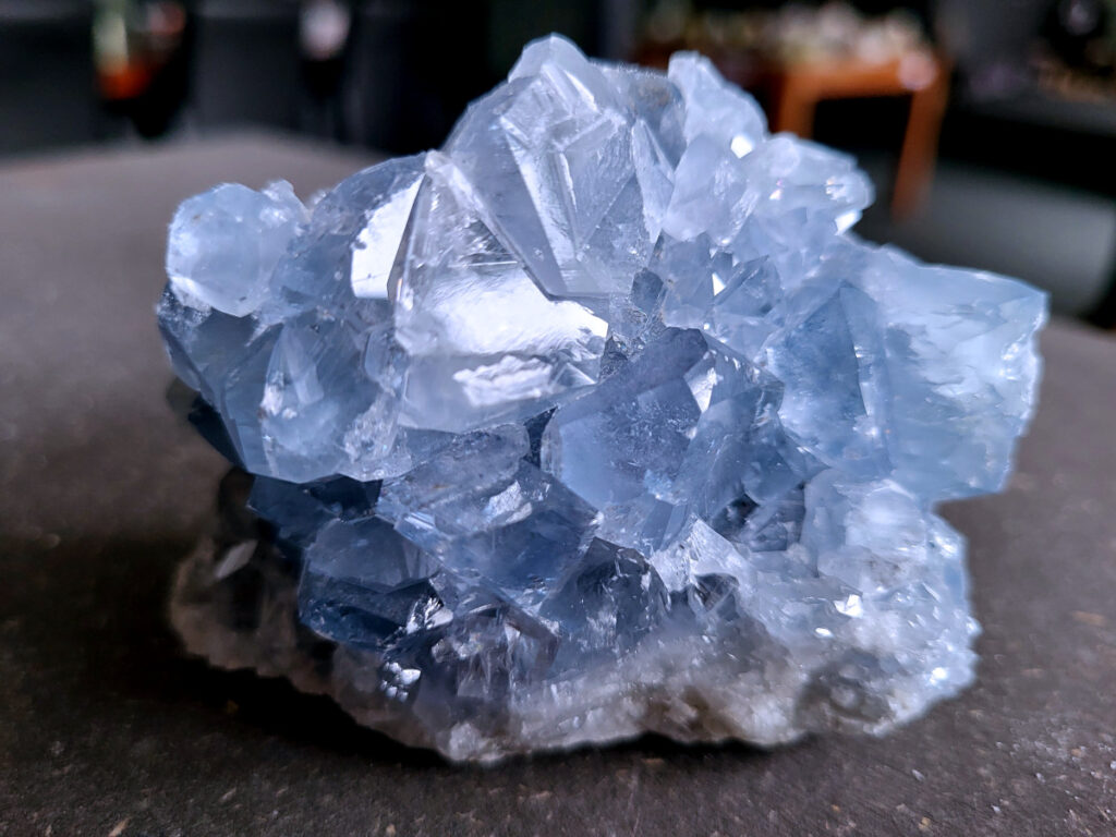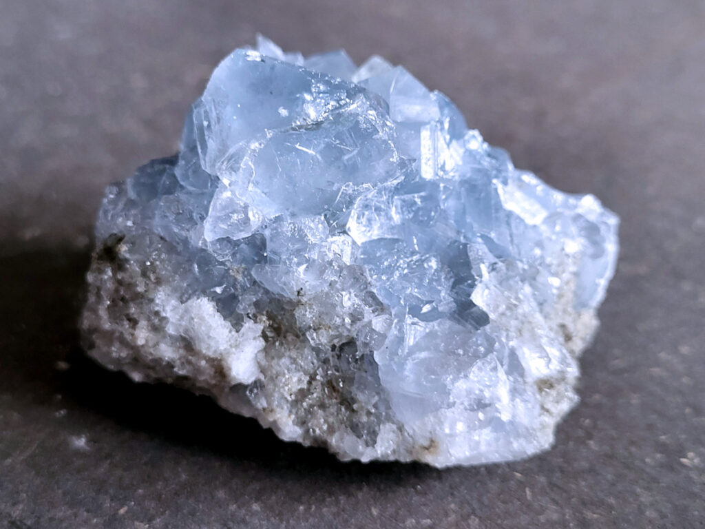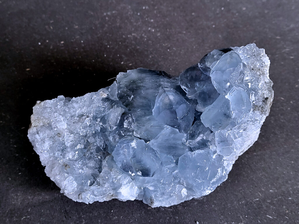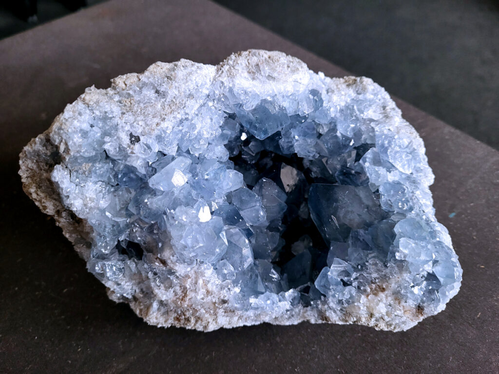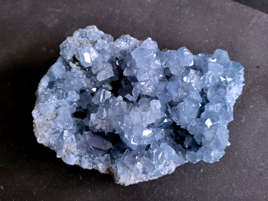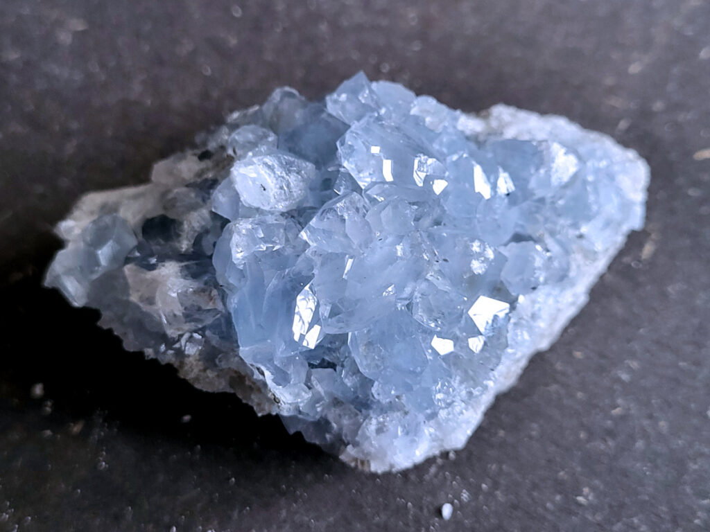Celestien is een gevoelige steen en kan beschadigen door water of zout.