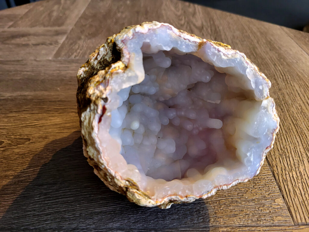 Botryoïdale chalcedoon is een unieke, druifvormige variant van chalcedoon (een microkristallijne kwartssoort) die groeit in bolvormige clusters, vergelijkbaar met een tros druiven. Deze mineraalstructuur ontstaat door radiale groei vanuit kiempunten. Het mineraal wordt gewaardeerd om zijn esthetische, natuurlijke vorm en vaak kalmerende, evenwichtige energetische eigenschappen.